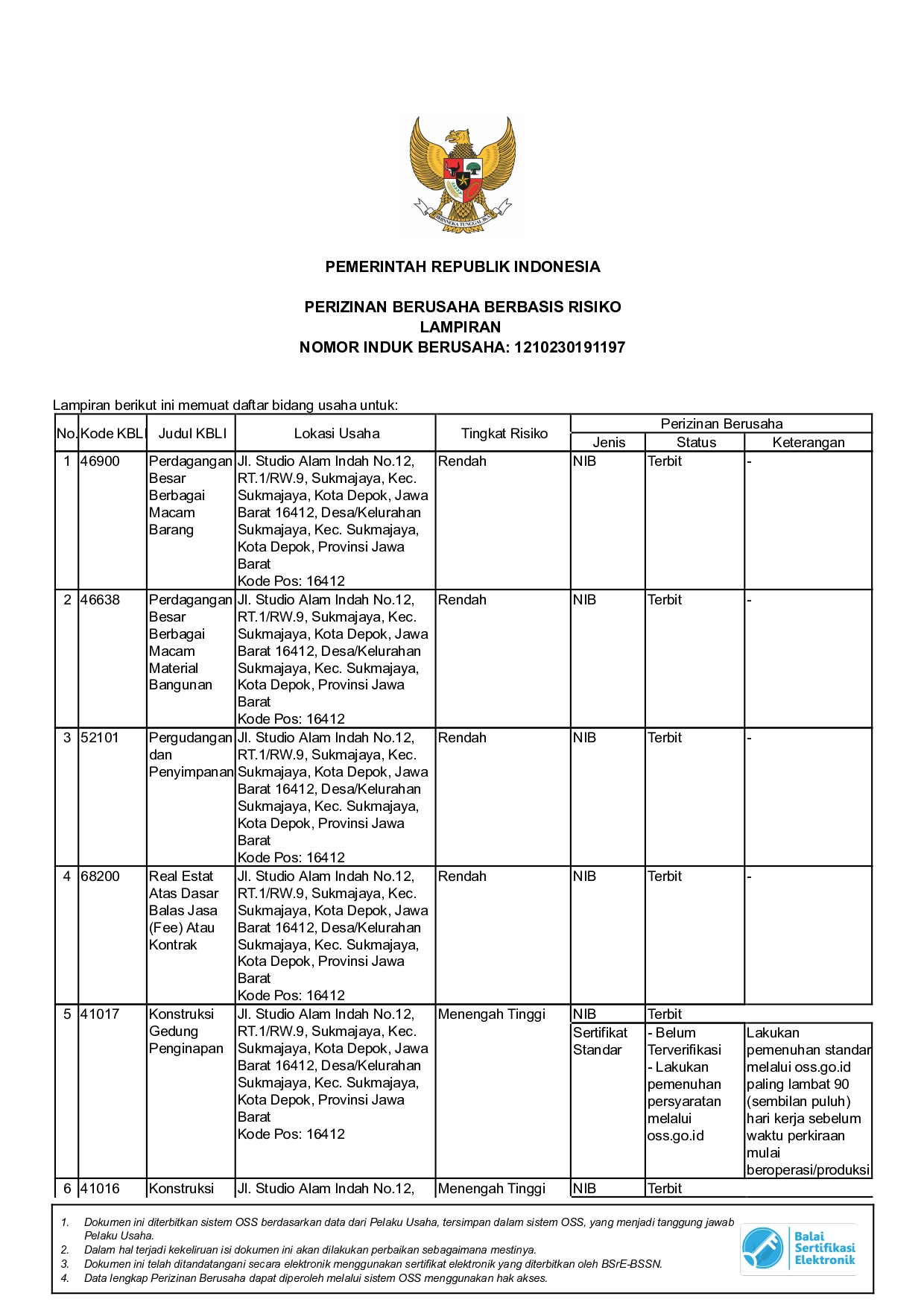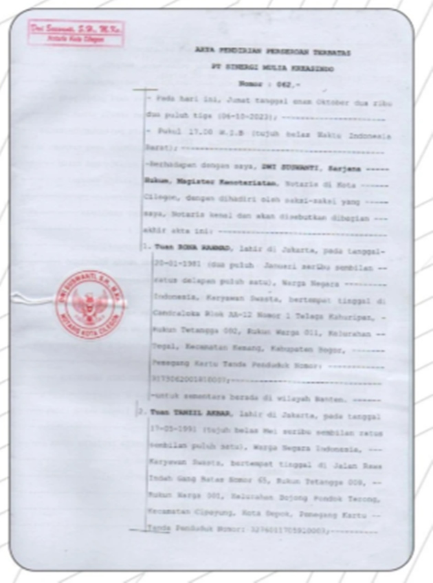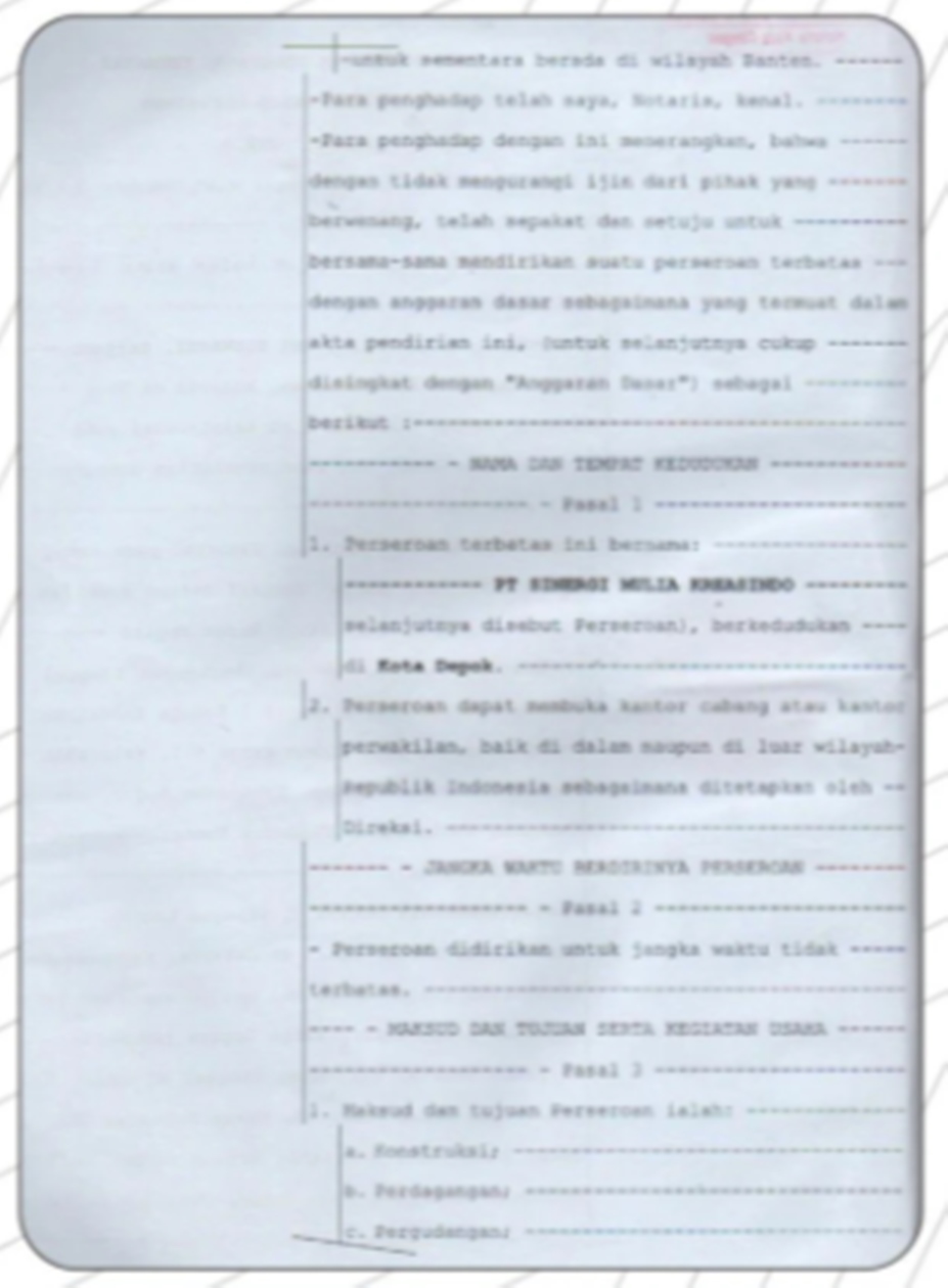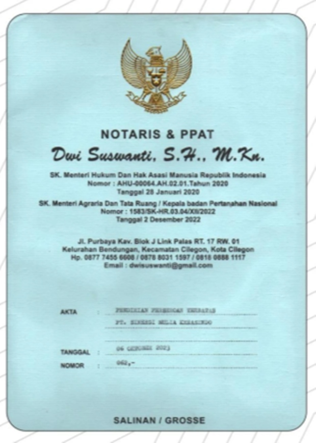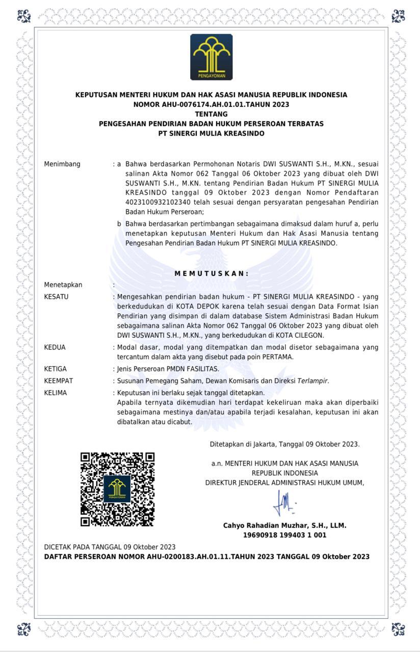 PT. Sinergi Mulia Kreasindo telah memiliki kelengkapan legalitas sesuai peraturan perundang-undangan yang berlaku di Indonesia. Legalitas ini menjadi fondasi utama dalam menjalankan kegiatan usaha secara profesional dan terpercaya. Dengan dokumen legal yang sah dan terdaftar, kami memastikan setiap proyek dan kerja sama dilakukan dengan transparan, aman, dan bertanggung jawab.